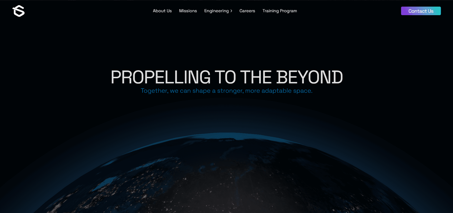 We designed and built a 9-page dark-mode website in Figma and deployed it via Framer — eliminating traditional development cycles while maintaining full responsive control. The design language uses deep space black (#000) with galactic blue (#00A3FF) accents and purple CTAs (#8B5CF6), anchored by a 3D rotating earth hero that immediately signals the company's orbital ambitions. Each product page features high-fidelity 3D renders of actual hardware, turning dense engineering specifications into visual narratives that non-technical stakeholders can grasp in seconds.