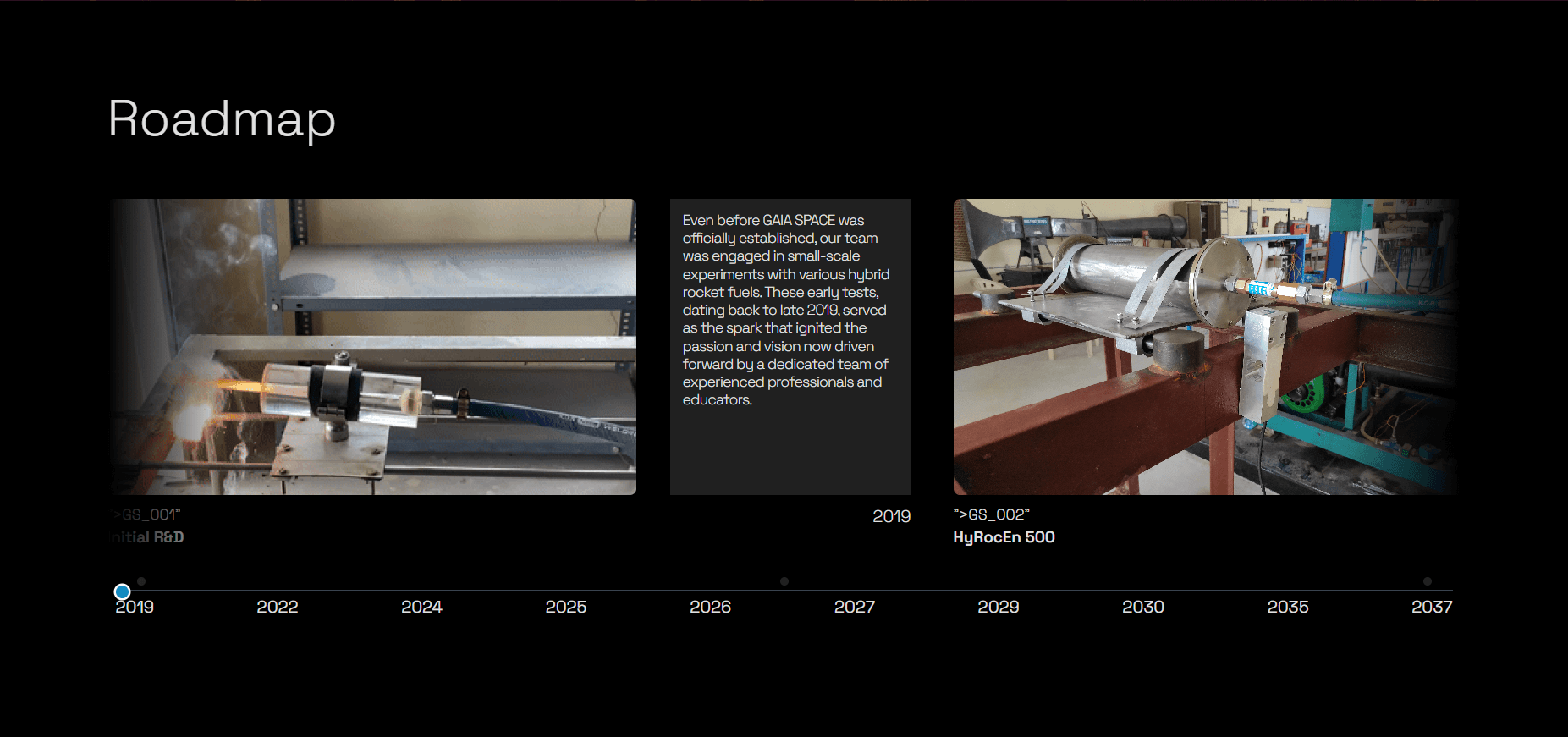 An animated horizontal timeline spanning 1938 to the present day, mapping humanity's key aerospace milestones directly into GaiaSpace's founding narrative. This isn't a decorative element — it contextualizes the company's mission against 85+ years of flight history, immediately positioning GaiaSpace as part of a larger legacy for first-time visitors.