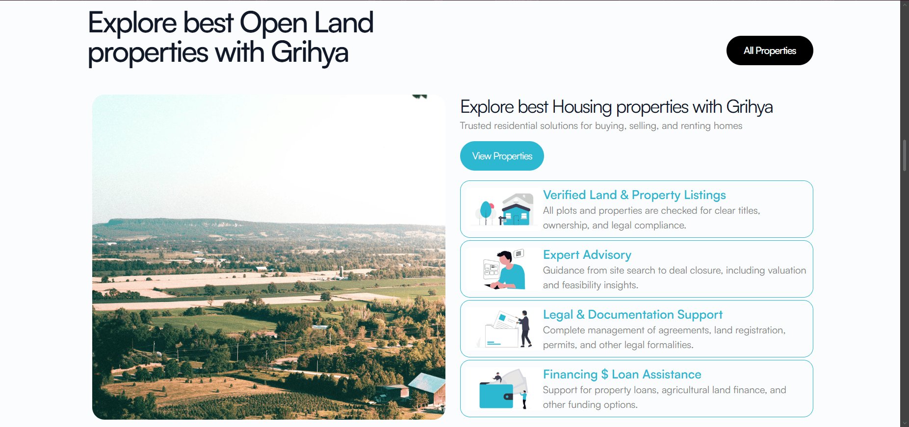 We designed and built a multi-page real estate platform in Figma and deployed it via Framer, creating a light-mode, aspirational design language with a teal (#00BCD4) accent system and full-bleed property photography. The homepage uses domain segmentation — splitting properties into Open Land, Housing, Commercial, and Rental categories — so buyers can self-route to their exact intent within seconds. We designed a custom CMS-driven property detail page that handles floor plans, photo galleries, amenity checklists, pricing metadata, and availability dates — all manageable by the client without developer support. To elevate the platform beyond a generic listing site, we created a custom illustration system (Dream Home, Smart Investment, Luxury Living, Advisory) that gives Grihya a distinctive brand personality.