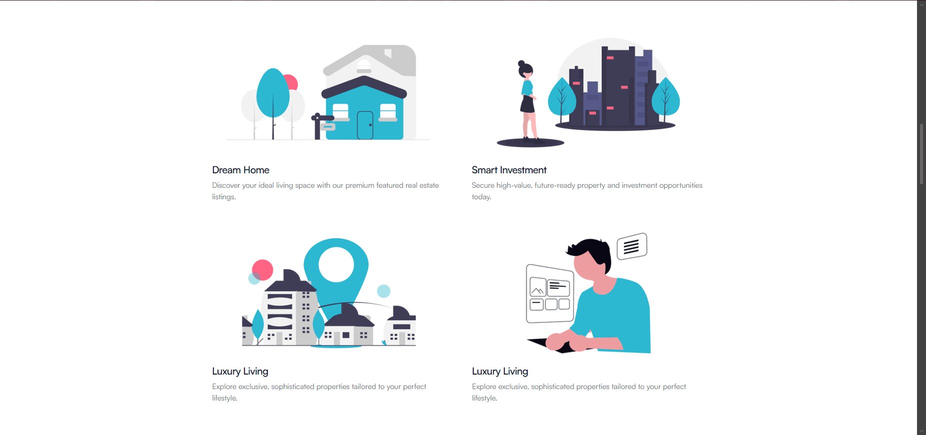 To differentiate Grihya from cookie-cutter real estate portals that all use the same Shutterstock photos, we designed a bespoke illustration set: Dream Home (suburban house with trees), Smart Investment (woman in urban skyline), Luxury Living (city with location pin), and Advisory (person with dashboard). These illustrations create a warm, approachable brand identity that balances the premium property photography with human-scale storytelling.